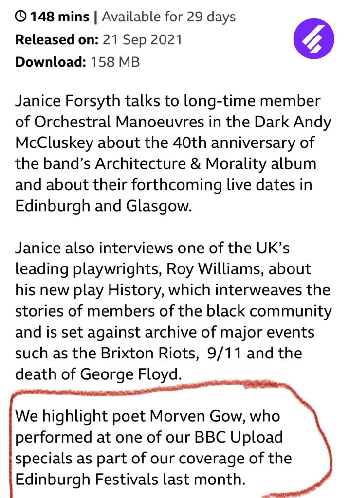 It was a bit alarming and weird to hear not just Jam but also the full interview on the wireless. But very nice at the same time. I wasn’t curled up in pain with my eyes shut tightly and my hands over my head, in a chair, listening, as I was when I first heard the wee audio clip of Jam I sent to BBC Radio Scotland Upload back in November ‘20. So, definitely getting easier!